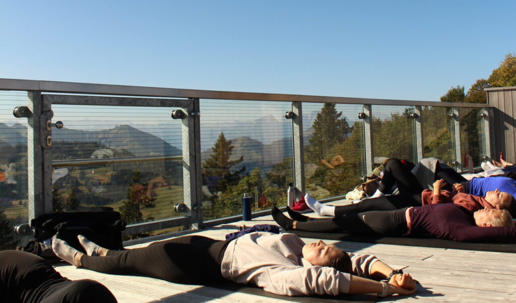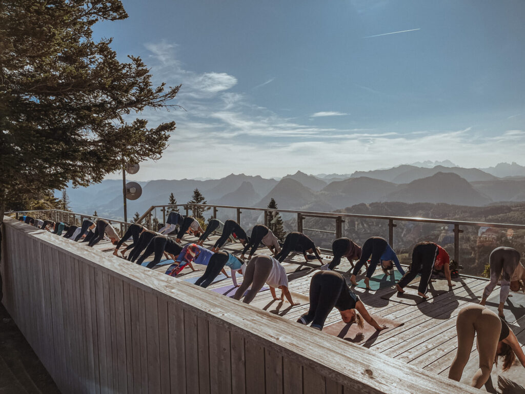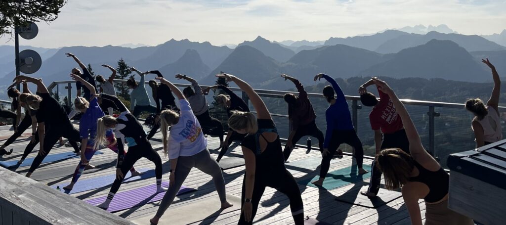 Yoga auf der Aussichtsplattform unterhalb des Zwölferhorn-Gipfelkreuzes ist einfach ein Genuss. Selbst im Liegen ist es möglich, die herrliche Aussicht auf Berge und Seen zu genießen. Sonne, leichte Windbrise und Weekend Vibes!