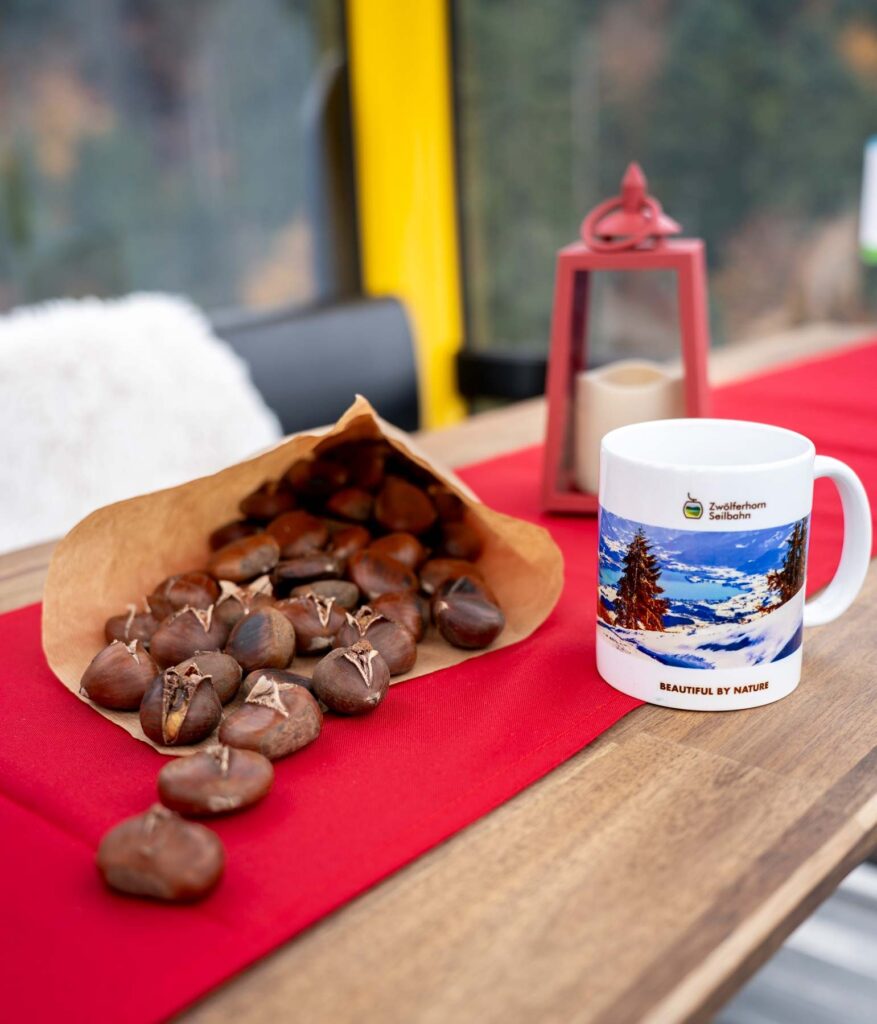 Ein besonderes Erlebnis ist die exklusiv buchbare Punsch-Fahrt im Advent mit unserer Zwölferhorn-Seilbahn: Punsch, köstliche Maroni, traumhafte Aussicht – ein echter Advent-Genuss.